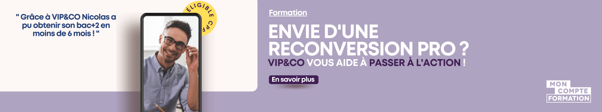 Chez VIP&CO nous avons à coeur la reussite de nos apprenants. Notre réactivité et notre adaptabilité nous permettent de répondre aussi bien aux besoins des dirigeants que des demandeurs d'emplois.